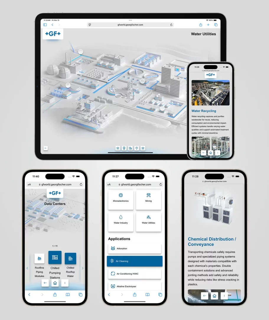 After seeing the success of the Virtual City experience we developed for Uponor, Georg Fischer (GF)—Uponor’s parent company—approached us to create a similar interactive platform for their own brand. The result was GF World, an immersive digital environment built using the same Progressive Web Application (PWA) technology originally developed for the Uponor project. For GF World, our team provided UI and UX input along with full front-end and back-end development, designed to run on large-format touchscreen displays for trade shows and event environments. The PWA architecture allowed us to deliver a highly interactive experience while maintaining a flexible and cost-effective deployment model. Like the original kiosks, GF World was designed to perform reliably on large touchscreens while also being easily adapted for web access, allowing the experience to extend beyond trade shows and be accessible to a broader audience online.